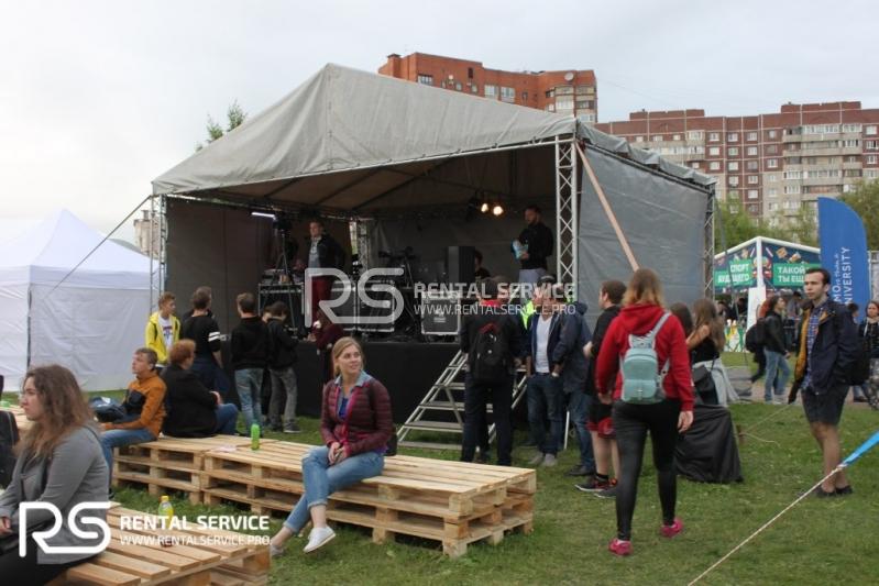 - Сценический подиум 14x3 c конструкцией из ферм, 6-ть кВт звука Jbl MRX c микрофонами и пультом, пультовой шатер - для зоны "Мода";