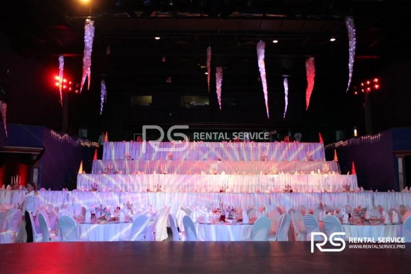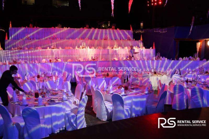 Техническое оснащение корпоративного мероприятия от команды Rental Service. Светодиодный экран 4x3 с шагом P6, работа видеоинженера, интерьерная подсветка зала и welcome зоны, комплексное световое оформление мероприятия.