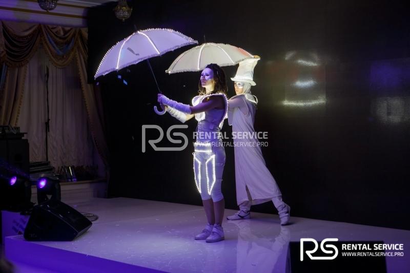 Свет: 10 ClayPaky Sharpy, 10 Arena Blindo, интерьерная подсветка 20 LedBar, пульт Hog4.