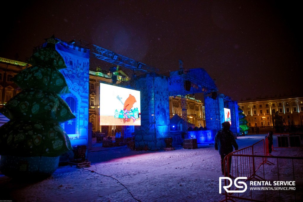 Техническое оснащение 2 светодиодными экранами 4×3 c шагом P4, пультовой и полное видео сопровождение на мероприятие «Встреча Всероссийского Деда Мороза из Великого Устюга» на Дворцовой площади от команды Rental Service.