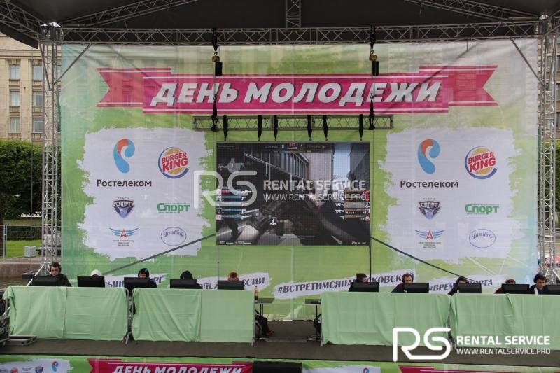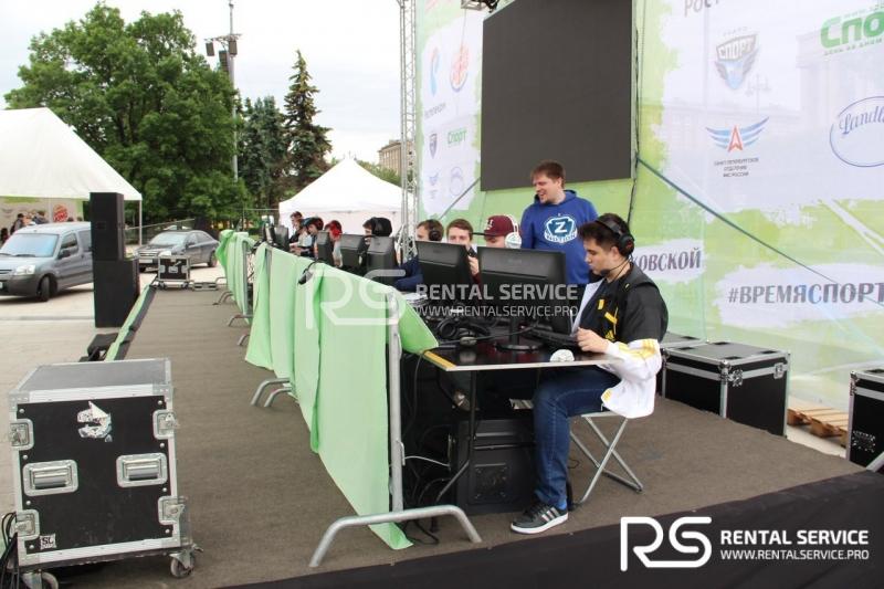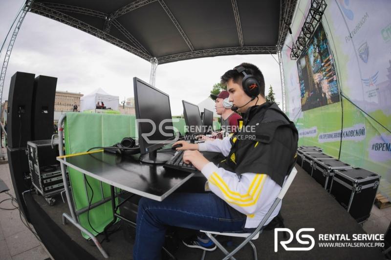 - Светодиодный экран с шагом P6 -3x2, граунд 12X10 и сценический подиум 12X4, акустическая система 10 кВт с микрофонами и пультом на основе ElectroVoice TX - для зоны компьютерных игр;