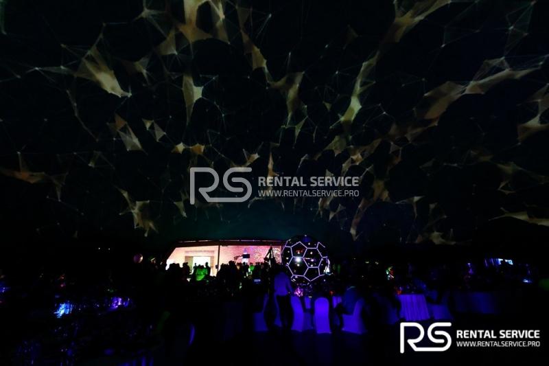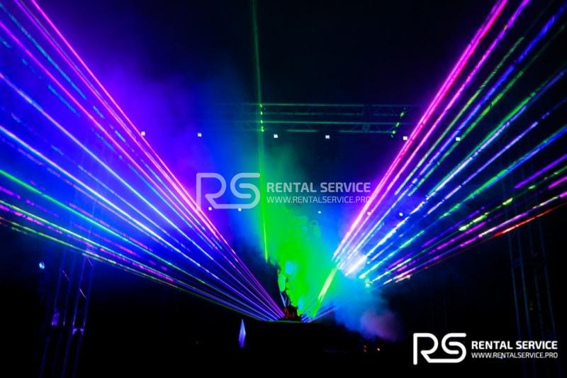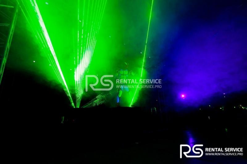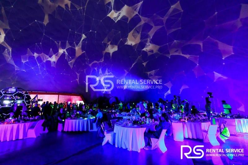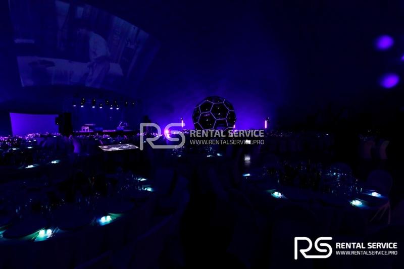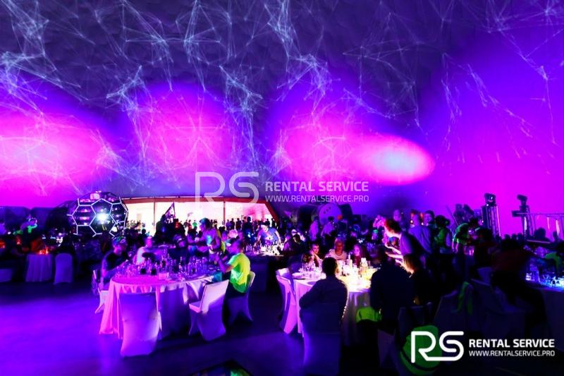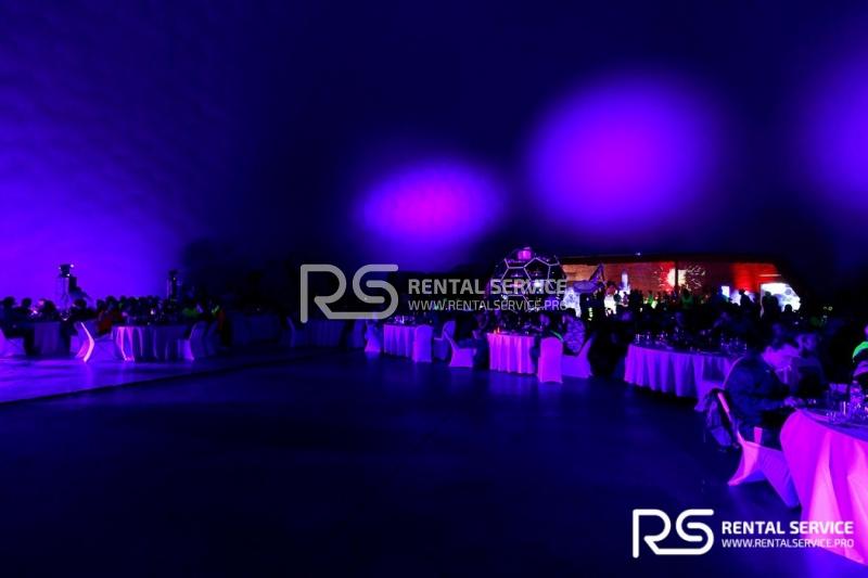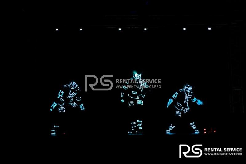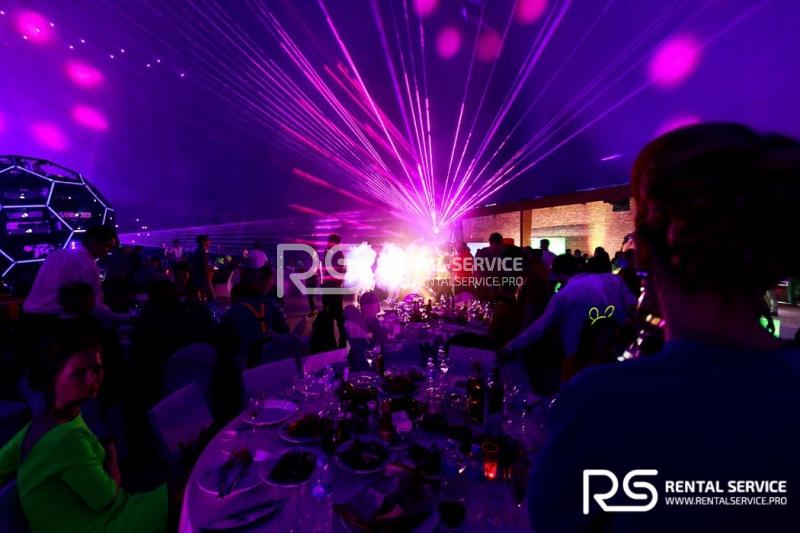 Техническое оснащение корпоративного мероприятия — звуковым, световым, видео оборудованием от команды Rental Service. 16 Robe Robin 600, 20 LedBar, 20 LedPar, 8 Sharpy, пульт Road Hog, 12 кВт звука TWAudio.