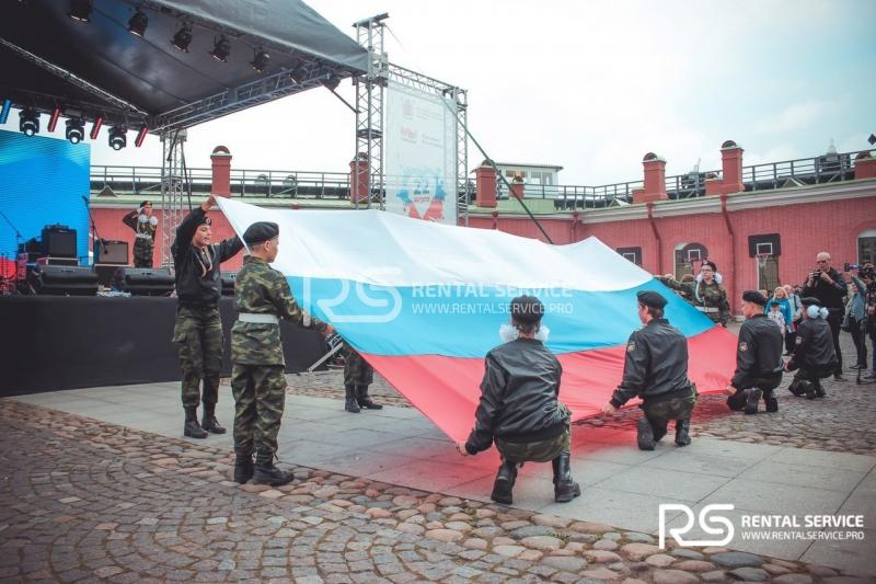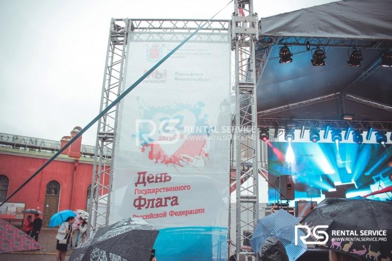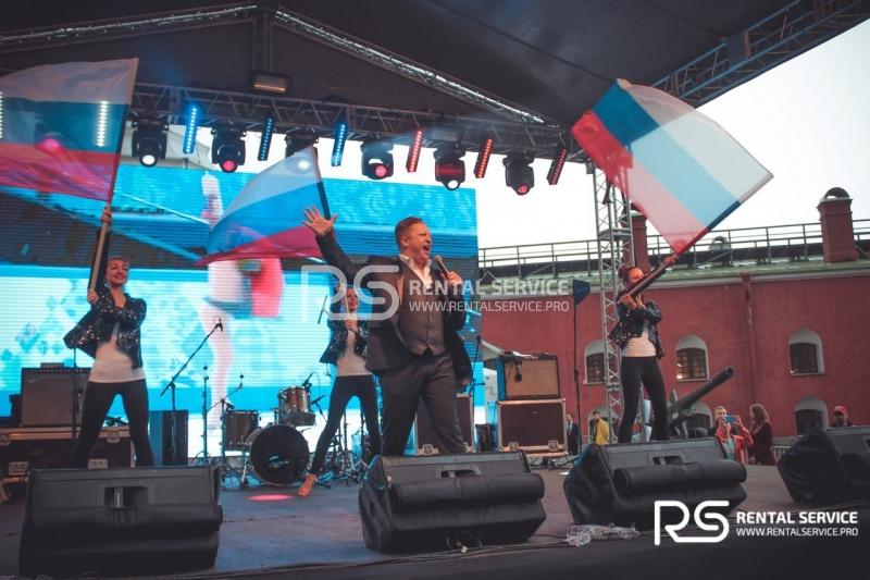 Техническое оснащение сценическим, звуковым, световым, видео оборудованием празднования «День Флага России 2017», на территории Петропавловской крепости от команды Rental Service.